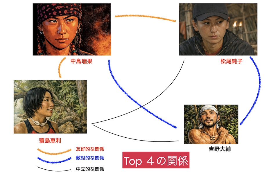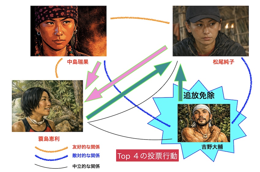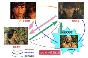 吉野氏は中島氏と強い敵対的関係にあり、松尾氏とも敵対的な関係にあった。蓑島氏とは良くはないが、悪い関係でもなかったようである。そして女性3人は良好な関係を保っていた。そのため、女性のうち誰かが追放免除ゲームに勝てば、問題なく吉野氏に3票が投じられる状況であった。